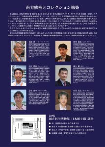 本年の南方熊楠賞受賞者の松浦啓一氏を始めとして、国立科学博物館の若手研究者や南方熊楠の研究者を招いて話題提供とパネルディスカッションを行います。博物館や研究機関が担うコレクション構築の意義を考えてみましょう。